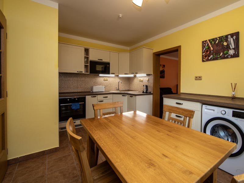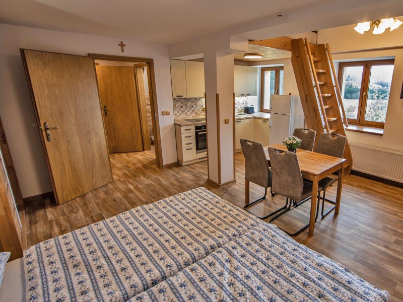 Ubytovací kapacitaV součastnosti je k dispozici pět apartmánů Vybavení apartmánů je z přírodních materiálů, nábytek je vyroben z dubového dřeva. |