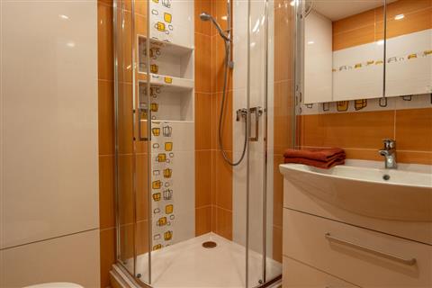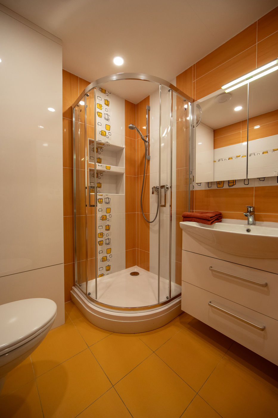 Koupelna: sprchový kout, WC, fén na vlasy, automatická pračka