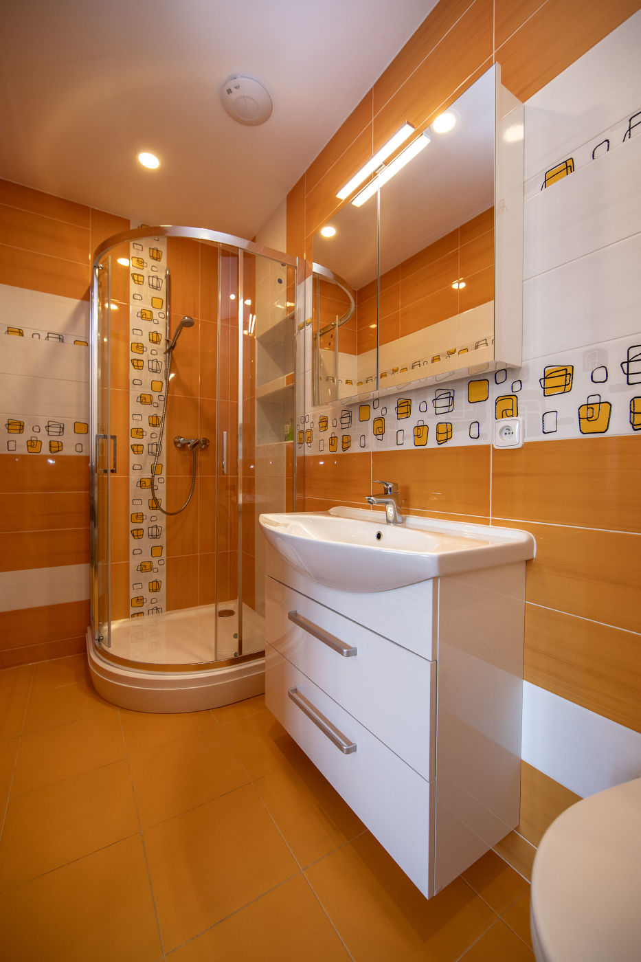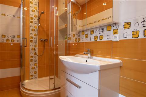 Koupelna: sprchový kout, WC, fén na vlasy, automatická pračka