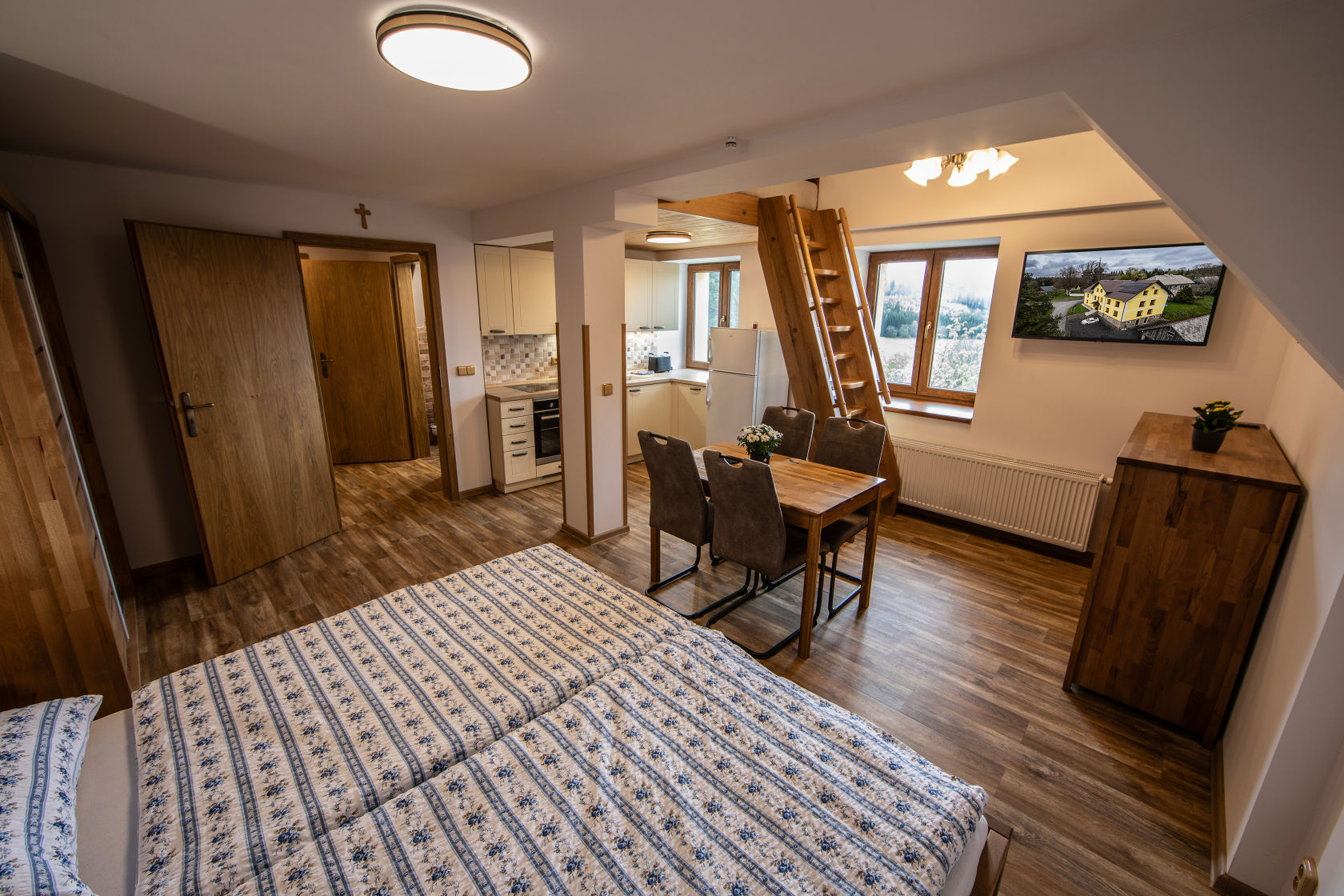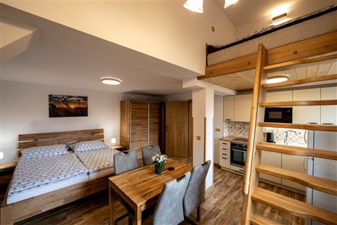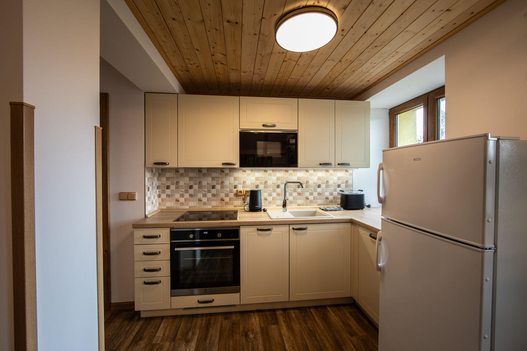 Kuchyň plně vybavená: lednice s mrazákem, el. trouba se sklokeramickou deskou, myčka nádobí, mikrovlnná trouba, rychlovarná konvice, toustovač, jídelní sety a nádobí.