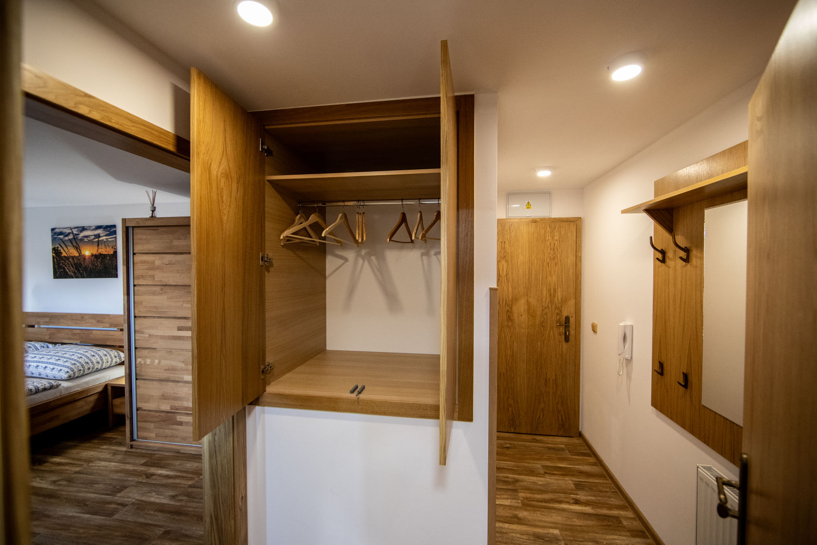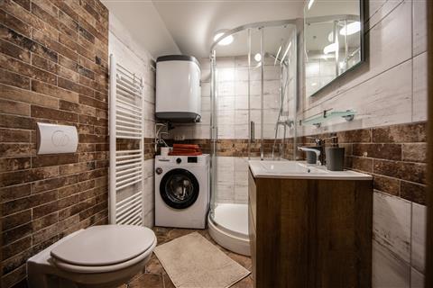 Koupelna: sprchový kout, WC, fén na vlasy, automatická pračka
