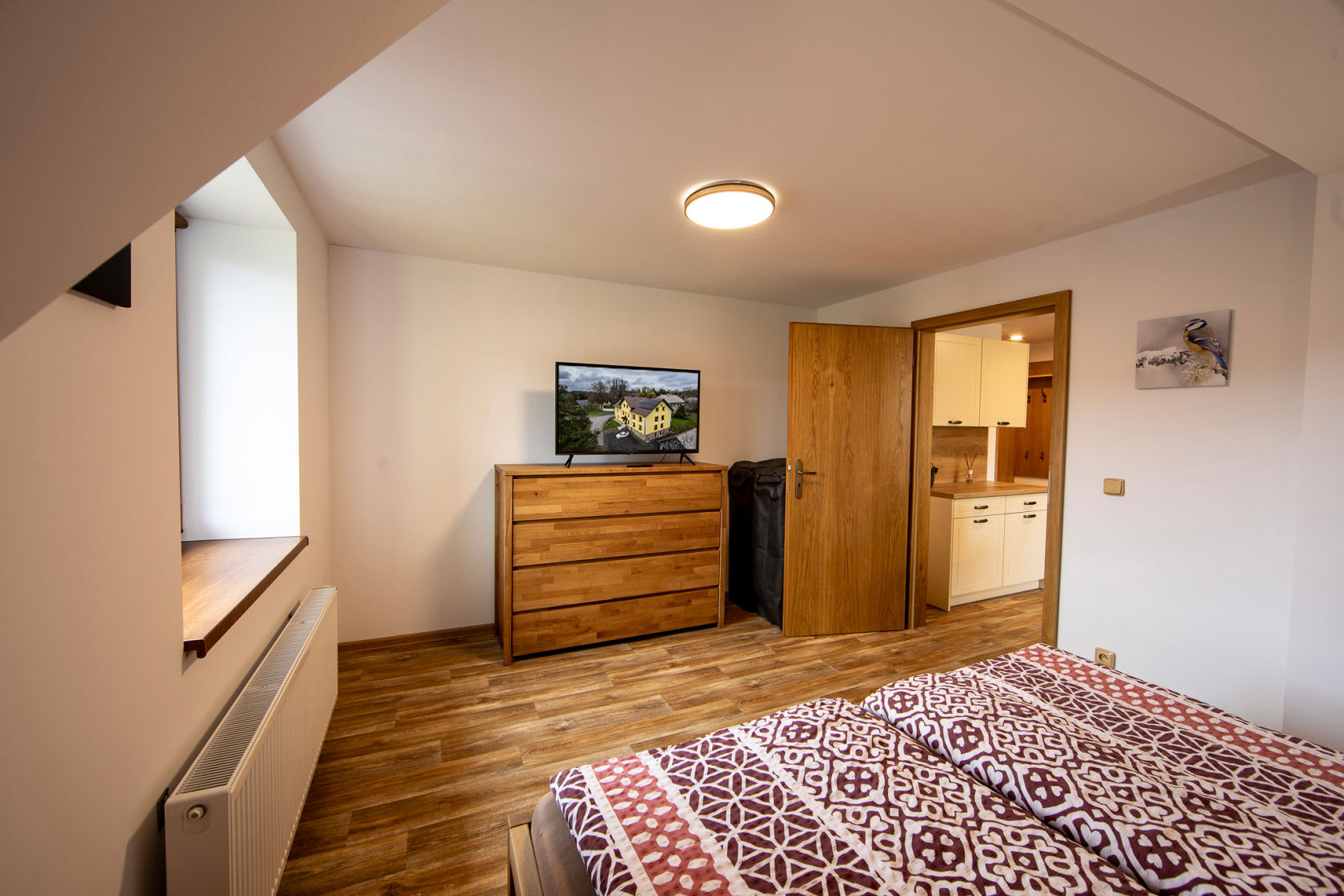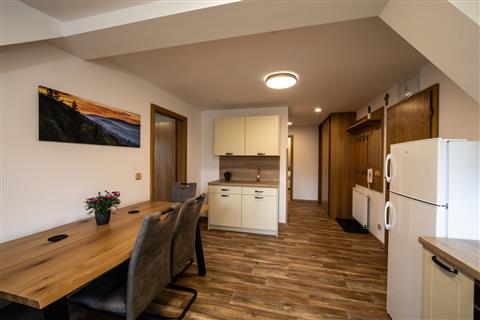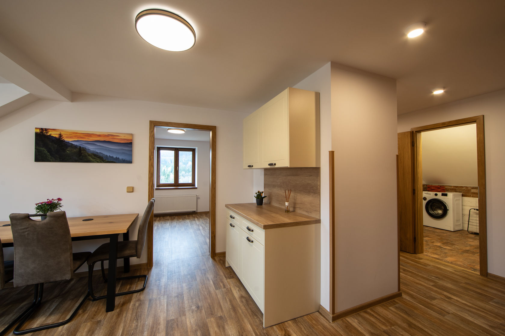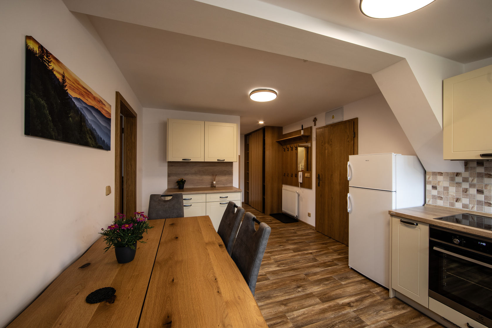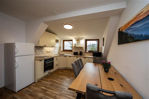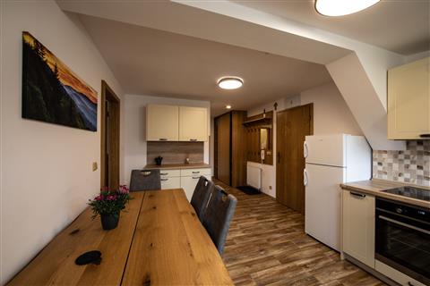 Kuchyň plně vybavená: lednice s mrazákem, el. trouba se sklokeramickou deskou, myčka nádobí, mikrovlnná trouba, rychlovarná konvice, toustovač, jídelní sety a nádobí.